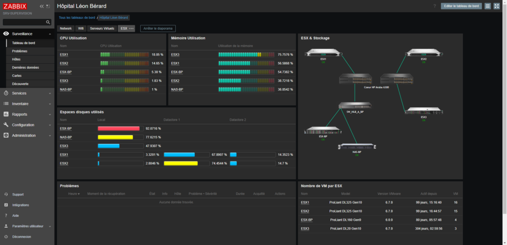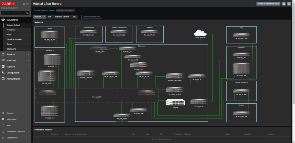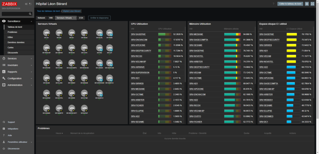 Ci-dessous je vais vous montrer nos différents tableaux de bords mis en place sur notre serveur Zabbix. (Normalement les adresses IP y sont affichés mais ici elles ont été retirer pour des raisons de confidentialité.)