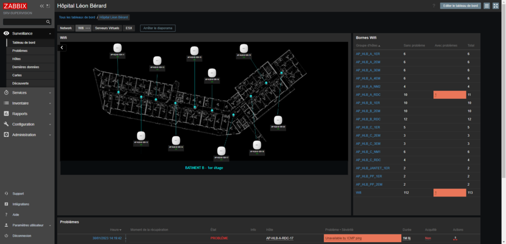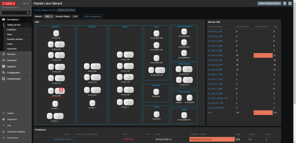 Ici c’est la cartographie des bornes Wi-Fi par bâtiment et par étage et comme on peut le voir sur la capture ci-dessous une borne Wi-Fi est HS ainsi on sait directement de quel borne il s’agit.