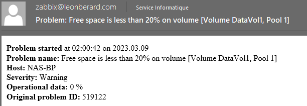 De plus une adresse mail de supervision a été mis en place afin de pouvoir être notifié si un problème est détecté sur l’une des machines. Comme ci-dessous on peut voir un mail d’alerte sur l’espace disque de notre NAS situé au bureau personnel.