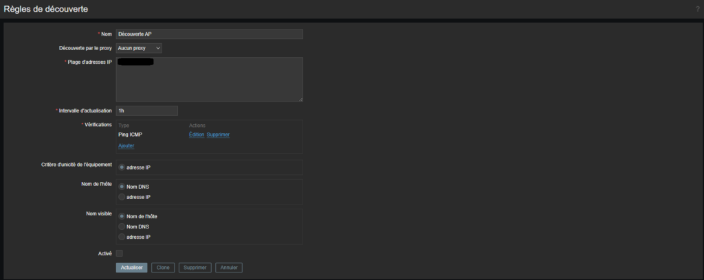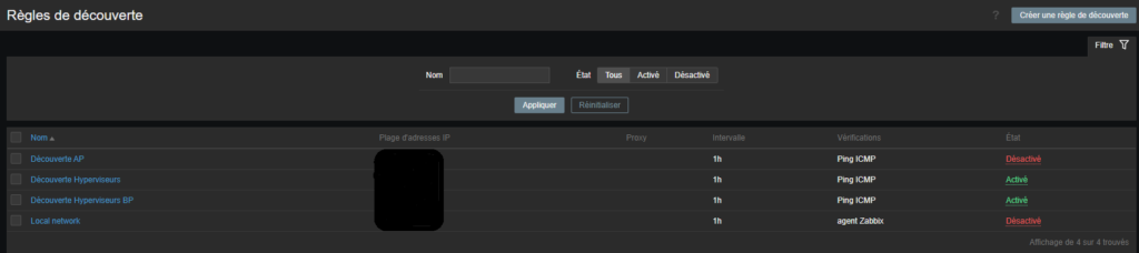 Pour la création des hôtes je vous invite a aller voir la mise en place de Zabbix que j’ai effectuer en centre. Ainsi je vais vous montrer ci-dessous les règles de découverte réseau que nous avons utilisés pour notre parc informatique.
